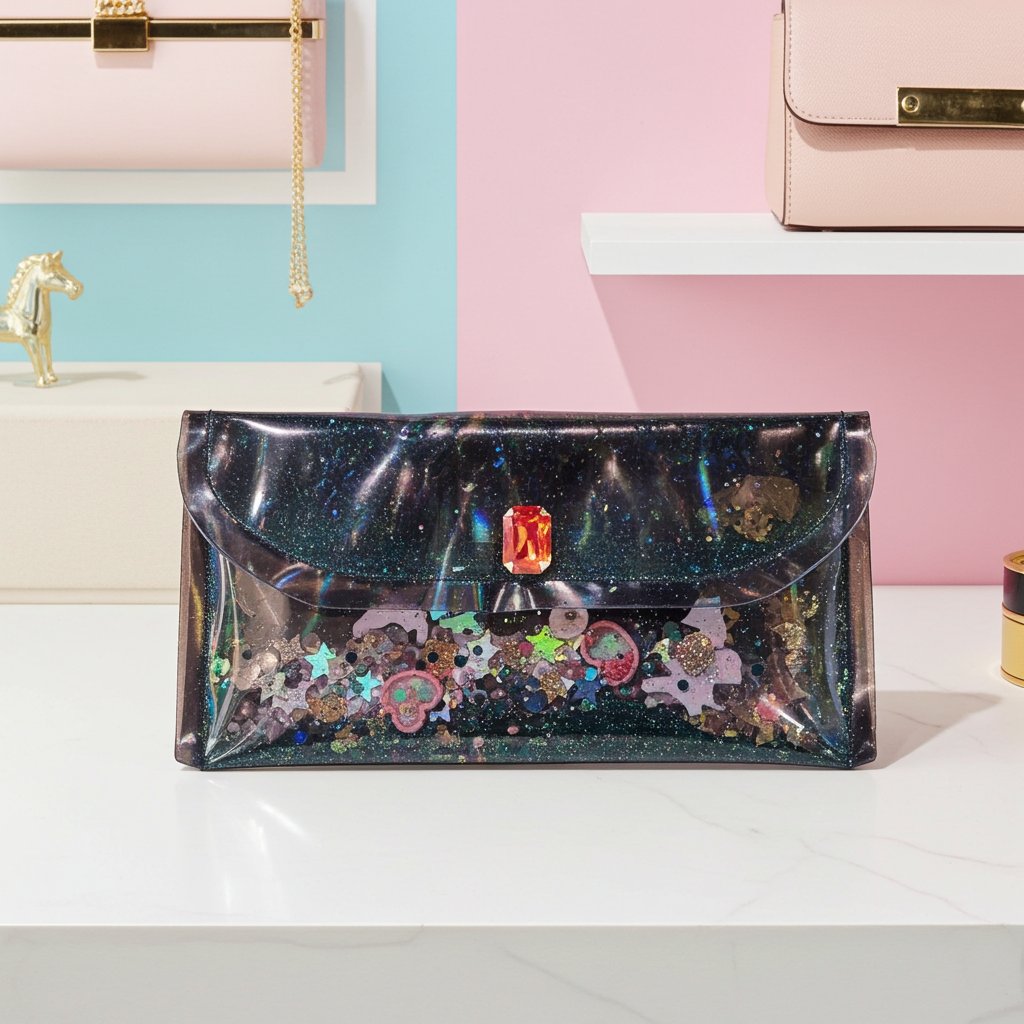 Shiny Sparkly and all that glitters in black. This large transparent handmade clutch by NaturaLee Maries is the perfect addiction to your accessory collection, a teens gift, or great for your daily routine. Along with a large Citrine Gem Stone… Sealed inside this holographic beauty are pearl cabochons, baubles, diamonds, sequins, stars, glittered cabochons, gold unicorns, glitter powder, and glitter. Each of our clutches and bags are uniquely different. Measures 4.25 x 8 inches. Please visit our contact page for custom order request.