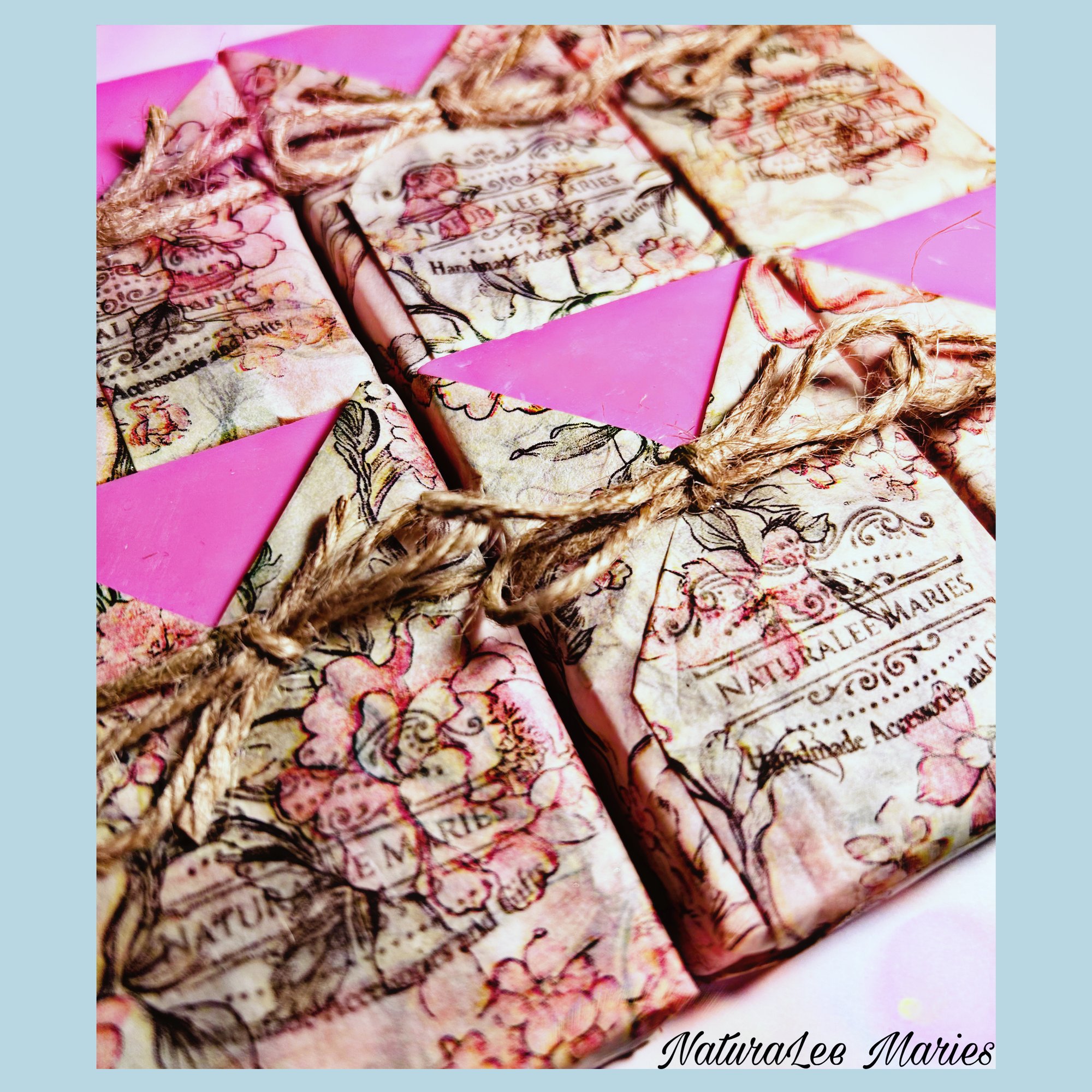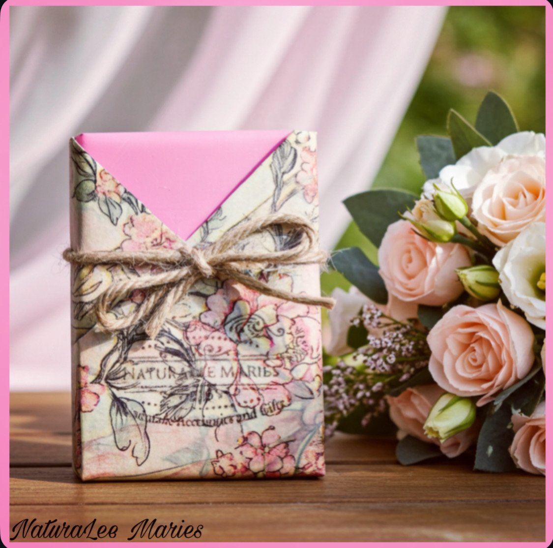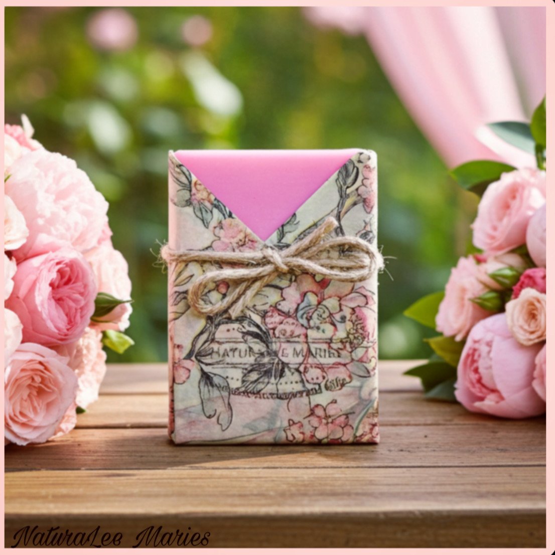 Celebrate your Bridal Shower with unique handmade favors with love by: NaturaLee Maries. Scented as if picked from a fresh Spring Rose Garden in color Blushing Rose. Made from goats milk with instilled properties such as vitamin E. These bars are moisturizing and exfoliating leaving a lasting impression for your guests. Packaged in vintage styled beautiful pink peony floral and ribbon wax paper, the delicate envelope design will be perfect for your event. Give the gift of love with NaturaLee Maries Bohemian Rose Soap Bars. Measures 3x2 inches.