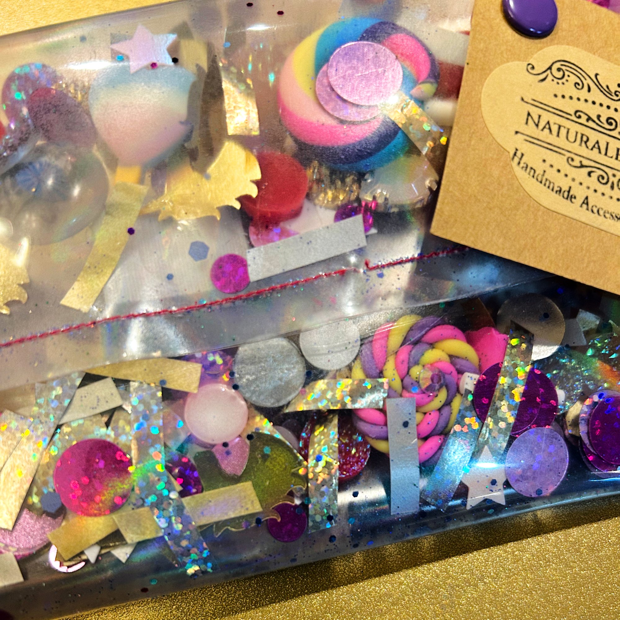 Shiny Sparkly and all that glitters in clearness. This large transparent handmade clutch by NaturaLee Maries is the perfect addiction to your accessory collection, a teens gift, or great for your daily routine. Sealed inside this holographic beauty are lollipops, diamond gems, pearl cabochons, baubles, sequins, stars, glittered cabochons, gold unicorns, glitter powder, and glitter. Each of our clutches and bags are uniquely different. Measures 4.25 x 8 inches. Please visit our contact page for custom order request.