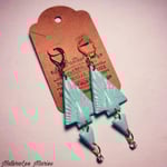 Art deco inspired handmade pale turquoise pair of drop and dangle earrings. These earrings sets the tone for vintage style and classic design. The imprints on the earrings adds texture and is a one of a kind wear. The diamonds attached to the bottom of this set dangles and shines like no other. Making this set a double pair there is a triangle piece adding beauty. Delicate jewelry that is made from polymer clay. Drops that are perfect and well made, attached is gold lever clasp for easy to wear application. Great as a gift to vintage lovers or for your every day occasion. Measures 3.25 inches long.