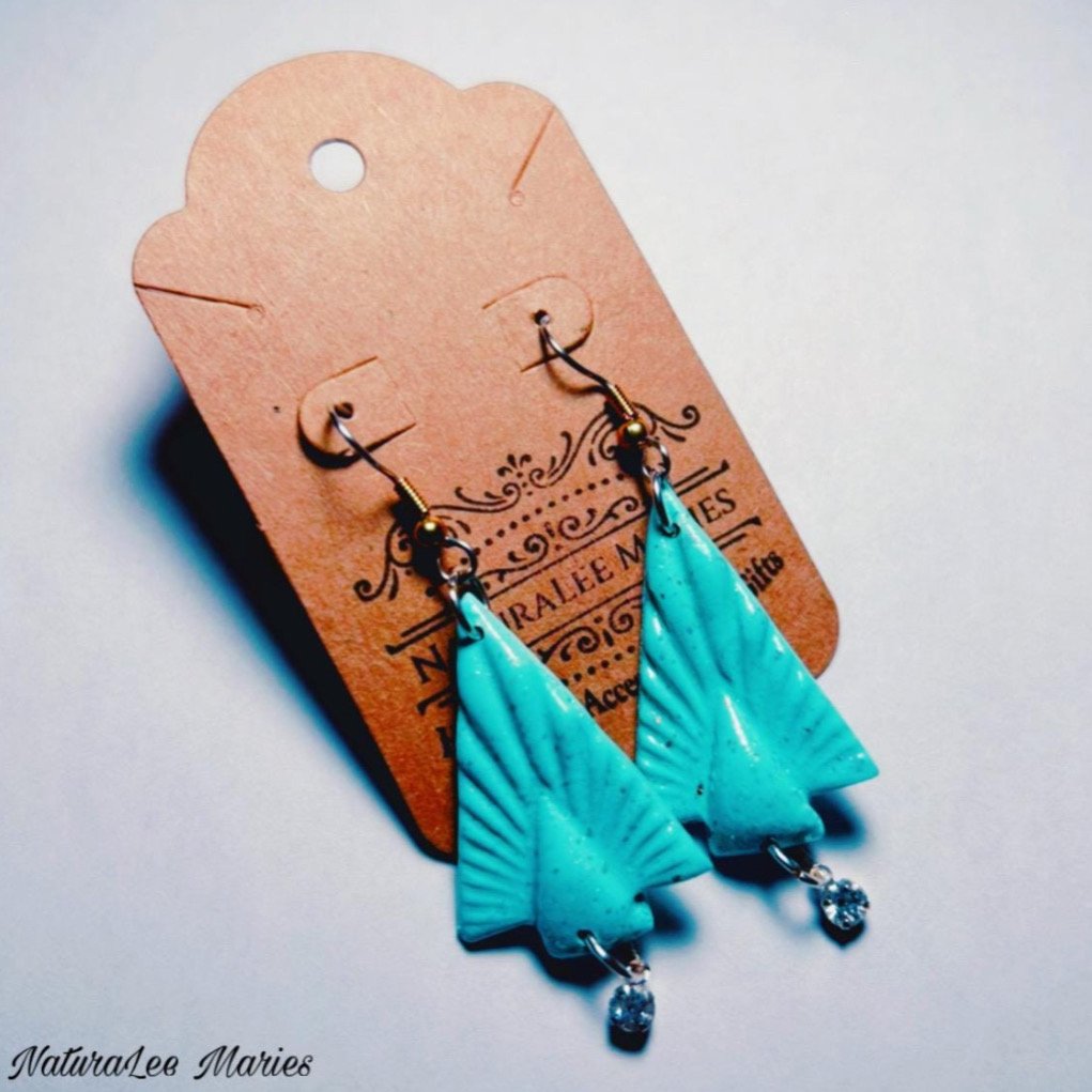 Art deco inspired handmade pale turquoise pair of drop and dangle earrings. These earrings sets the tone for vintage style and classic design. The imprints on the earrings adds texture and is a one of a kind wear. The diamonds attached to the bottom of this set dangles and shines like no other. Delicate jewelry that is made from polymer clay. Drops that are perfect and well made, attached is silver fish hooks for easy to wear application. Great as a gift to vintage lovers or for your every day occasion. Measures 2.50 inches long.