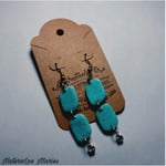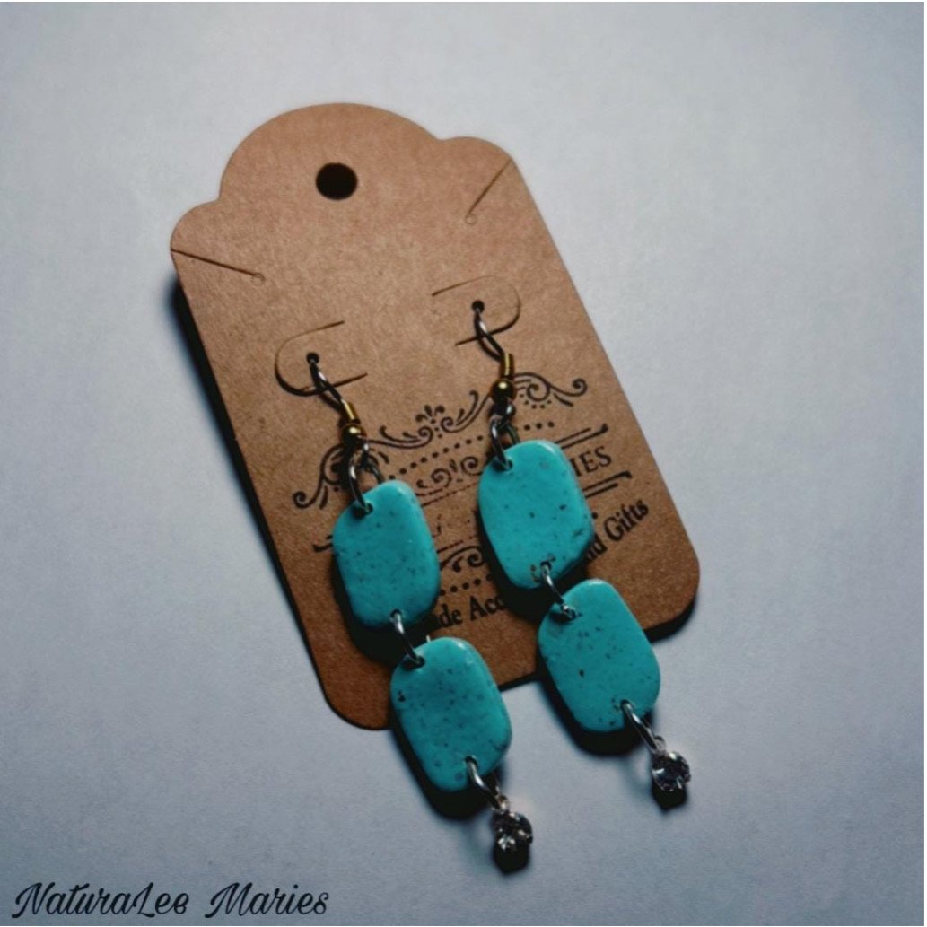 Beautiful handmade Moroccan styled pale turquoise and gold stone earrings. These beach wear earrings are made from polymer clay and crafted to perfection. Drop and dangle double irregular set that you will love for years to come. Great as a gift to wear on a vacation, or to an event. Compliment your look with beautiful attire. Gold foil and specks shimmers throughout with style, with silver findings and diamonds. These earrings are also sealed with protection for lasting wear. Silver jump rings and easy to wear ear wired clasps are added to complete this style. Measures 2.25 inches long.