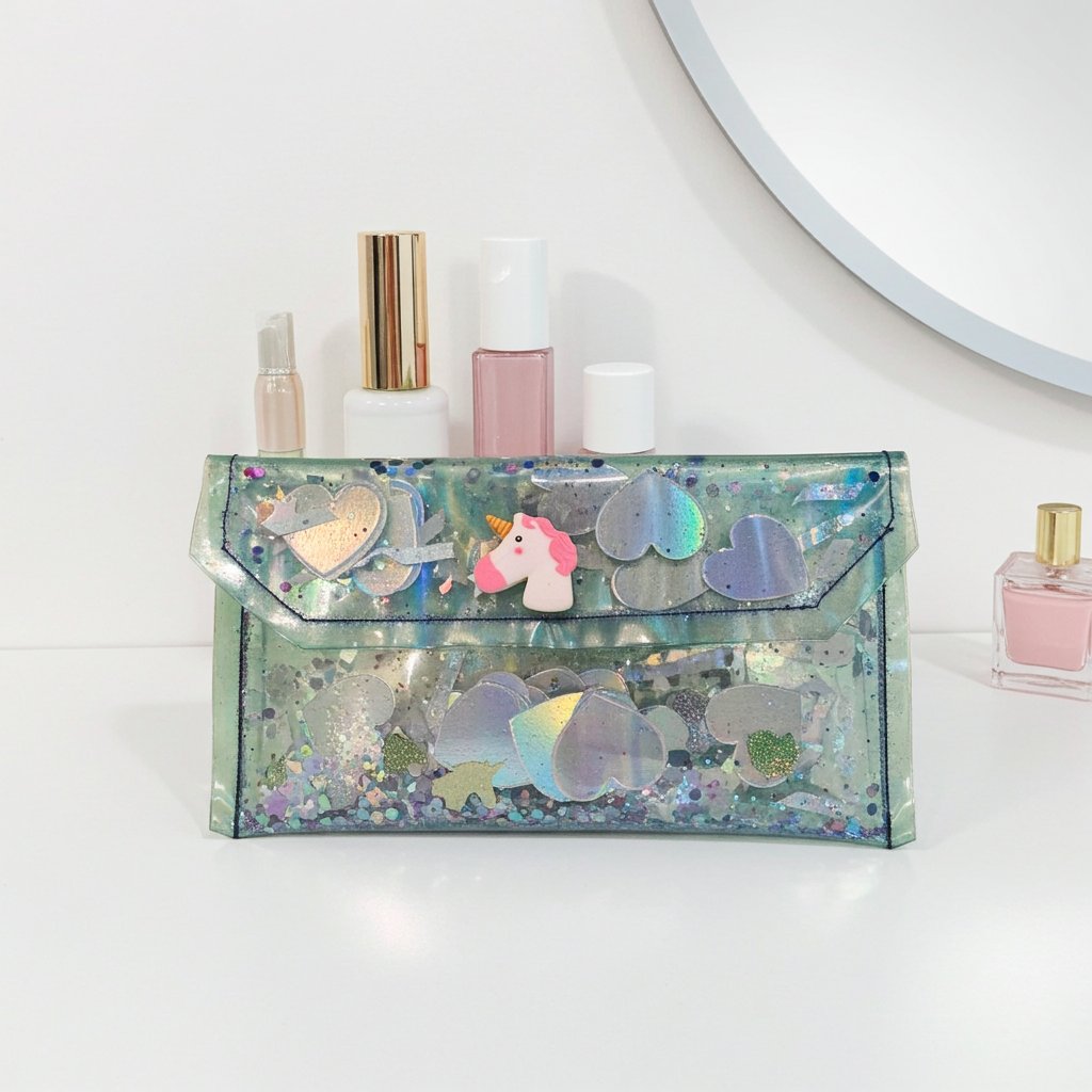 Shiny Sparkly and all that glitters in pastel green. This large transparent handmade clutch by NaturaLee Maries is the perfect addiction to your accessory collection, a teens gift, or great for your daily routine. Along with a Large Pink Unicorn, sealed inside this holographic beauty are large holographic hearts, gold unicorn minis, appliqués, holographic streamers, and glitter. Each of our clutches and bags are uniquely different. Measures 4.25x 8 inches. Please visit our contact page for custom order request.