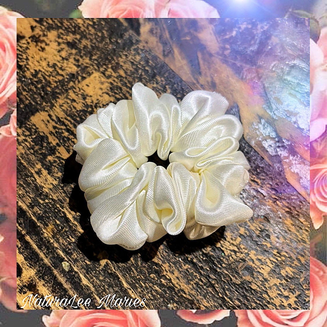 Beautiful Large Medium and Small Scrunchies handmade with love. Stretchable hair tie to keep your hair secure. Ready to wear pearl white satin fabric for year round. NaturaLee Maries scrunchies are perfect for all, will not leave dents in your hair and also prevents frizz. Measures 6x6 inches large, 5x5 inches medium and 4x4 inches small. For large quantities please visit contact page.