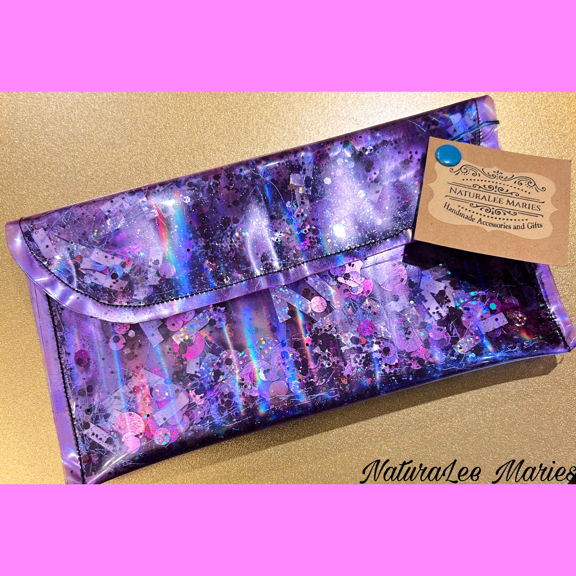 Shiny Sparkly and all that glitters in purple. This large transparent handmade clutch by NaturaLee Maries is the perfect addiction to your accessory collection, a teens gift, or great for your daily routine. Sealed inside this holographic beauty are loose silk tassels, round holographics, geometric irregular holographics, holographic streamers, sequins, stars, glitter powder, and glitter. Each of our clutches and bags are uniquely different. Measures 4.25 x 8 inches. Please visit our contact page for custom order request.