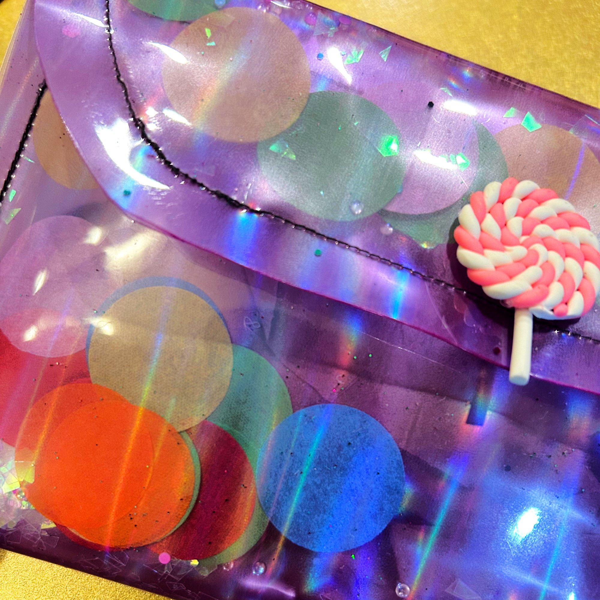 Shiny Sparkly and all that glitters in purple. This large transparent handmade clutch by NaturaLee Maries is the perfect addiction to your accessory collection, a teens gift, or great for your daily routine. Along with a large round swirl lollipop, sealed inside this holographic beauty are large round multicolored tissue confetti, geometric irregular holographics, small diamonds, small holographic cabochons. Each of our clutches and bags are uniquely different. Measures 4.25 x 8 inches. Please visit our contact page for custom order request.