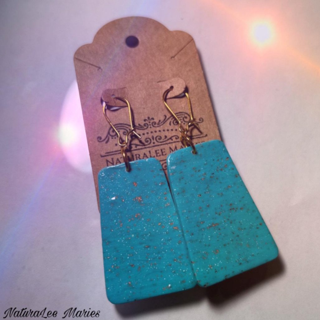 Beautiful handmade Moroccan styled turquoise and gold stone earrings. These earrings are made from polymer clay and crafted to perfection. Drop geometric pyramid set that you will love for years to come. Great as a gift to wear on a vacation, or to an event. Compliment your look with beautiful attire. Gold foil specks shimmers throughout with style. These earrings are also sealed with protection for lasting wear. Gold jump rings and easy to wear ear wired clasps are added to complete this style. Measures 2.75 inches long.