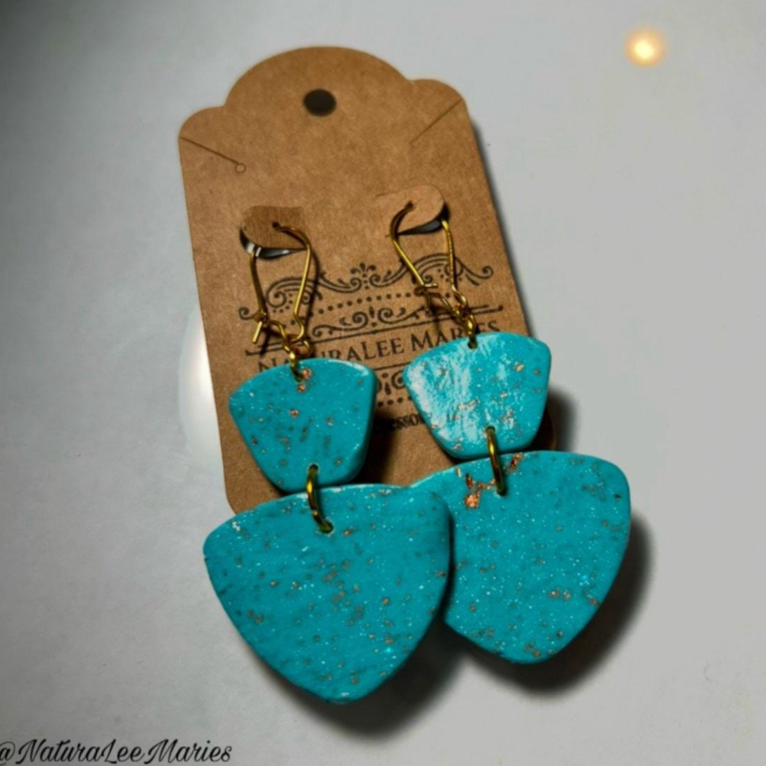 Beautiful handmade Moroccan styled turquoise and gold stone earrings. These earrings are made from polymer clay and crafted to perfection. Drop and dangle double geometric trapezium and triangle set that you will love for years to come. Great as a gift to wear on a vacation, or to an event. Compliment your look with beautiful attire. Gold foil specks shimmers throughout with style. These earrings are also sealed with protection for lasting wear. Gold jump rings and easy to wear ear wired clasps are added to complete this style. Measures 2.50 inches long.