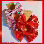 Beautiful Handmade and Machine Sewn Valentines HairBows for your little Kuties! These bows are shipped in a set of 4. You will receive 2 of the Sheer Red Glitter Hearts and Roses Hair Bows, and 2 of the Red Lace Gold Hearts Metallic Hair Bows. These bows will be precious on your little ones for Valentines Day. Both styles measures 3.75 x 3.75 inches. Great for Toddler and up sizing. There is a small alligator clip attached to bows for easy adjusting. Perfect for pig tails, and pony tails, also great as Valentines gifts.